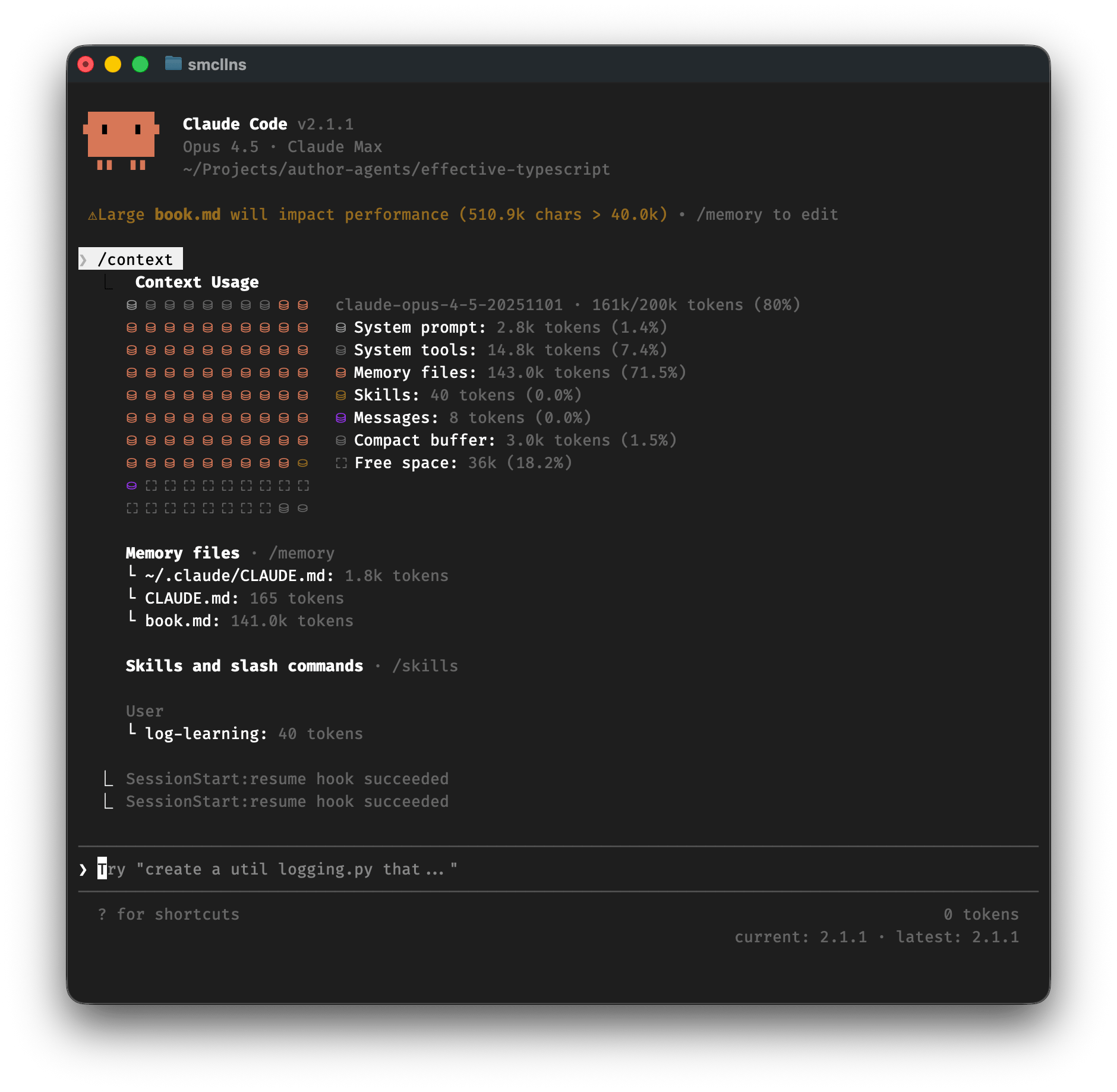 This book consumed 95.5K tokens, leaving ~85k tokens for conversation before Claude would need to autocompact ahead of Claude’s ~200K context window. This meant I could ask around one question, get a complete answer and discuss back and forth but I would need a fresh session for each big question.